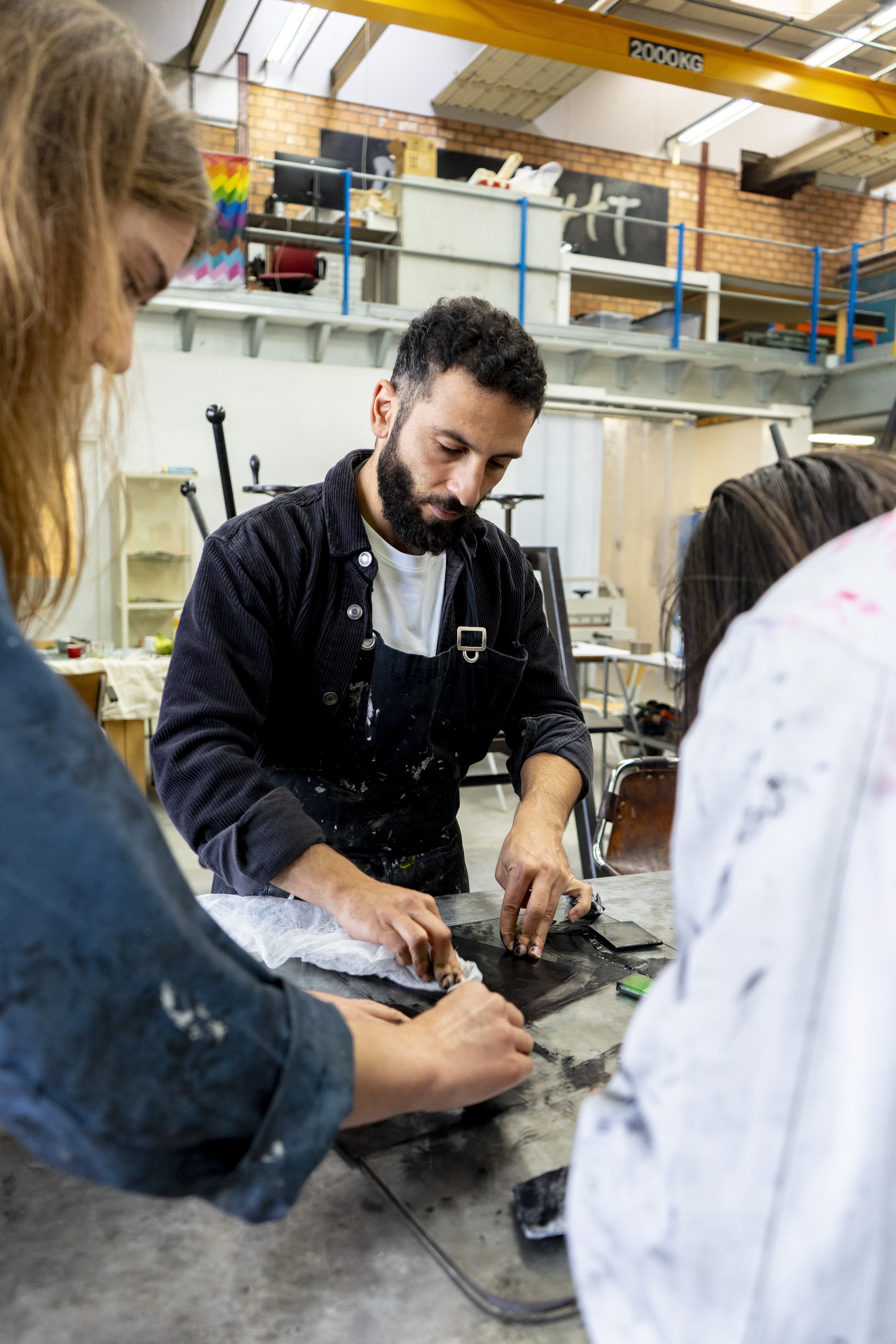 By maintaining this flexible mindset, Khattar had numerous new experiences at the Make workshop. Coming in as often as possible, he explored many techniques, seeing how they interacted with his work. “Working with screenprinting was a new experience for me, and it didn’t immediately feel like something I could seamlessly integrate into my work. I realized it’s a technique I need to explore further to determine when and how it might fit into my practice. It’s a slow, meticulous process that requires practice to achieve refined results. Even choosing colors was challenging!