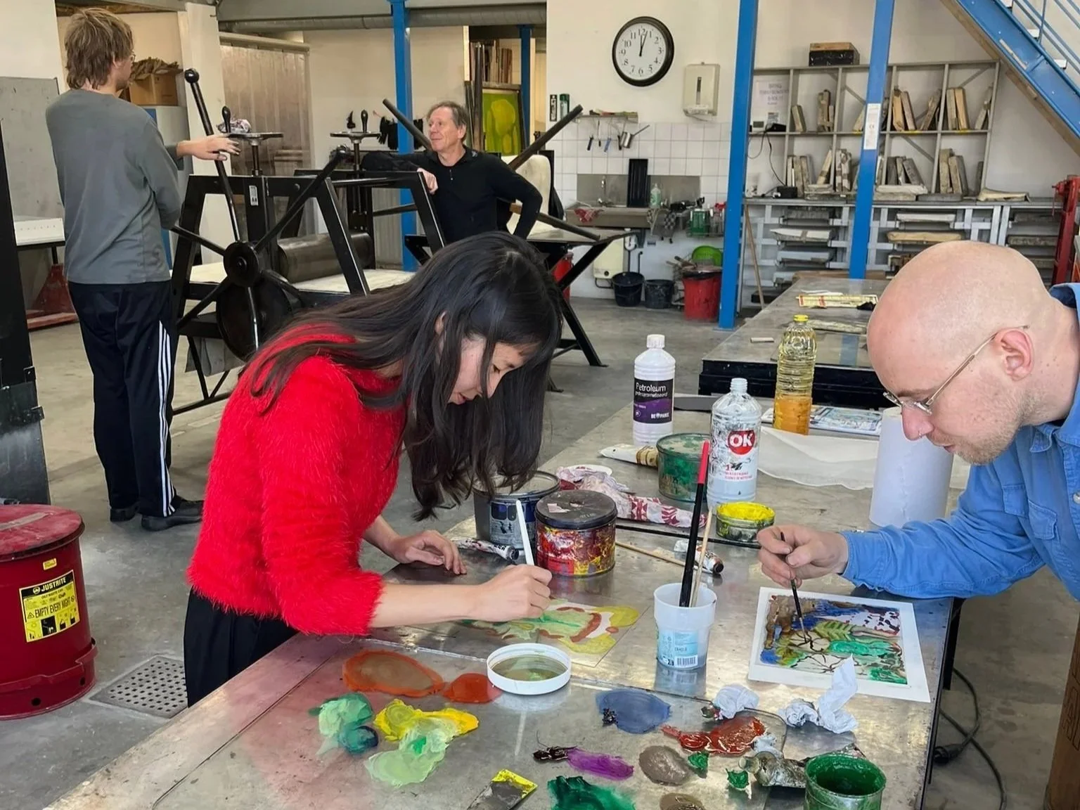 The seventh edition of the residency ‘To Riso or Not’ started last week at Make Eindhoven. Wobby.club and Make Eindhoven host this intensive work period, where five young artists dive into the world of graphic techniques. They are experimenting not only with the fast and playful Risograph printer but also with other printing methods. Some of the techniques they have used so far: drypoint, monoprint, toyobo, silkscreen and risoprint.