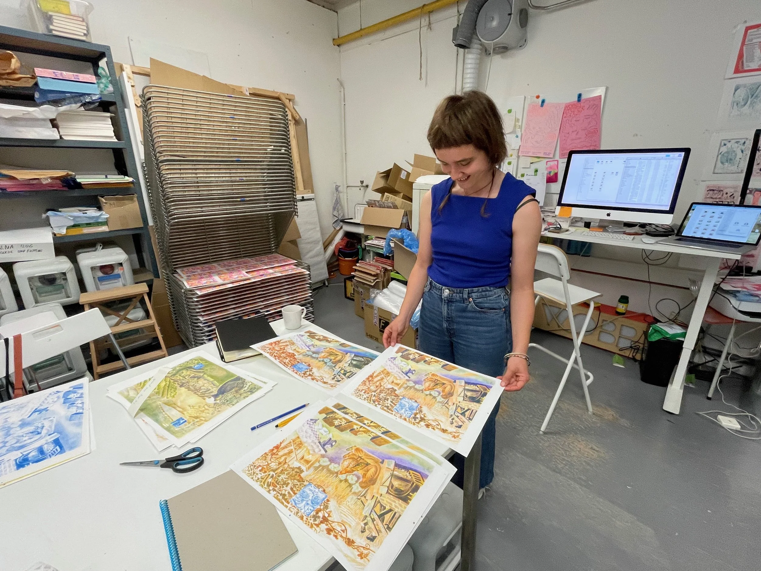 Wobby Workout is a work period at our studio in NS16, Tilburg. In this focused setting, artists can explore and experiment with the Risograph printer, developing new ideas and techniques independently. In the summer of 2025, multimedia artist Marina Sulima (born in Moldova, living in the Netherlands) joined us for a residency. During her time in the studio, she explored how drawing and printing could merge, treating the Risograph as an extension of her practice.